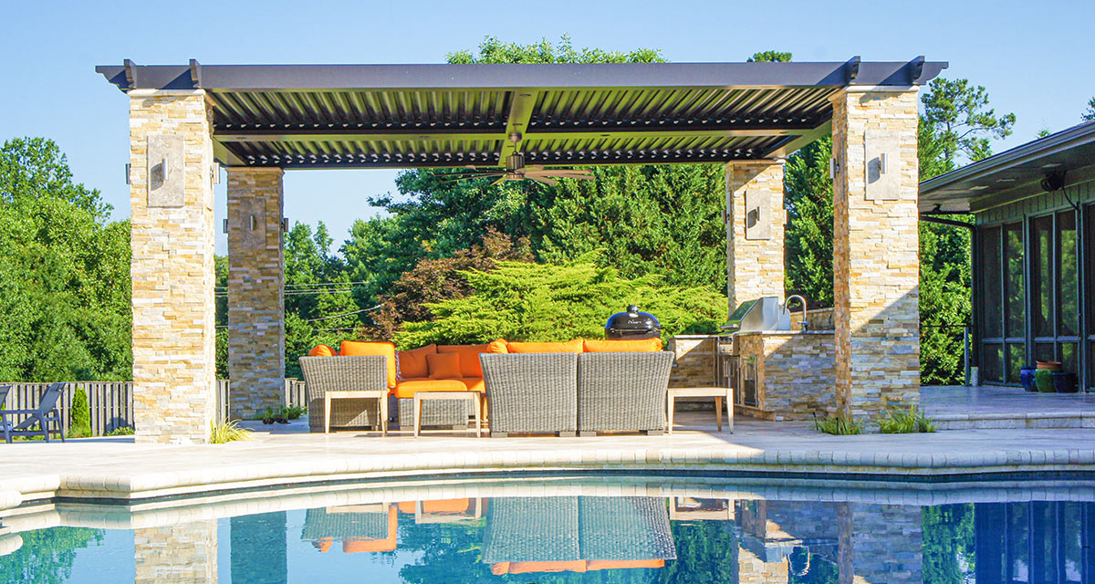 The Roper Mountain Road Residence was transformed into a premier outdoor living space with new outbuildings, a renovated pool and spa, fire pit, custom driveway, fencing, and gates all seamlessly integrated with the existing home.