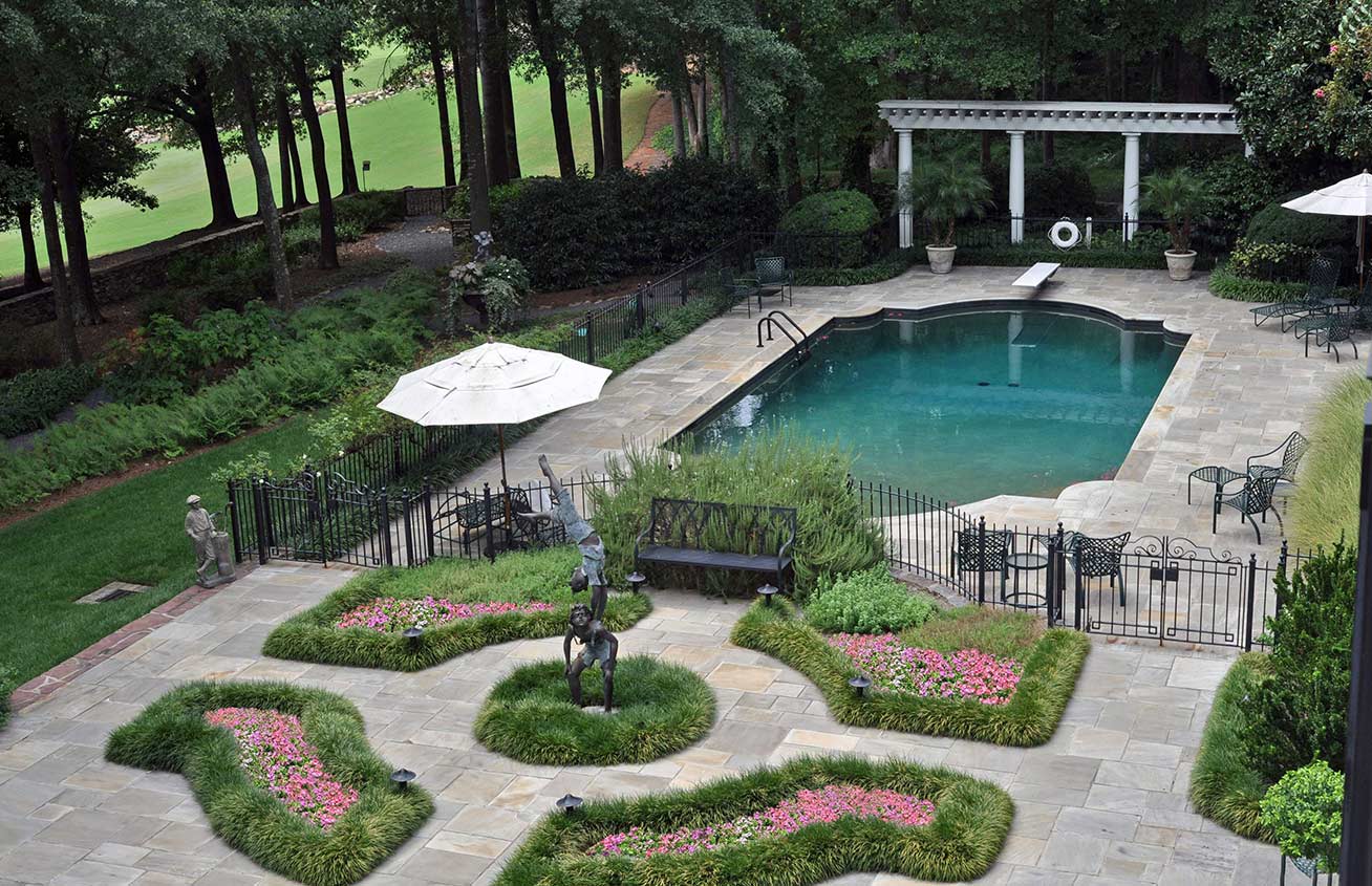 At the Chanticleer Estate, we designed the landscape for a 5-acre estate on a scenic golf course, featuring a luxurious pool, spa, water feature, and elegant arbors and terraces. A formal garden adds sophistication and enhances the estate’s serene, grand atmosphere.